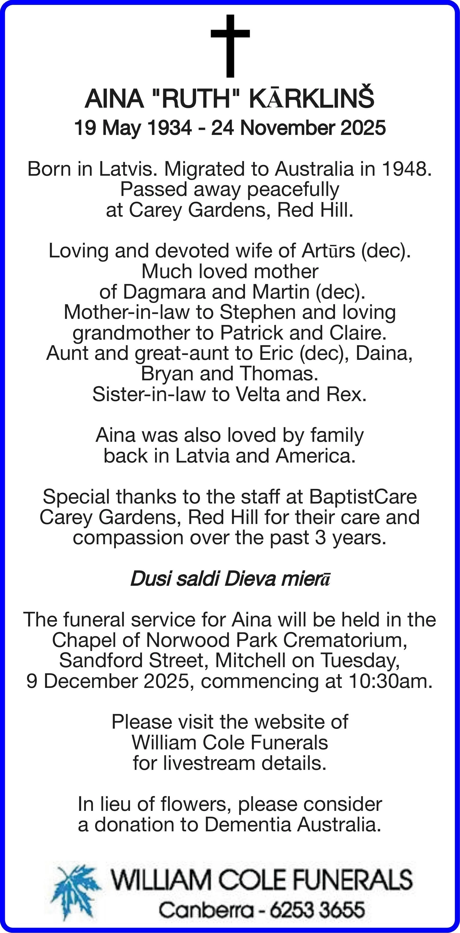 Aina’s family have requested in lieu of flowers, please consider a donation to Dementia Australia - the national peak body supporting people living with dementia, their families and carers.