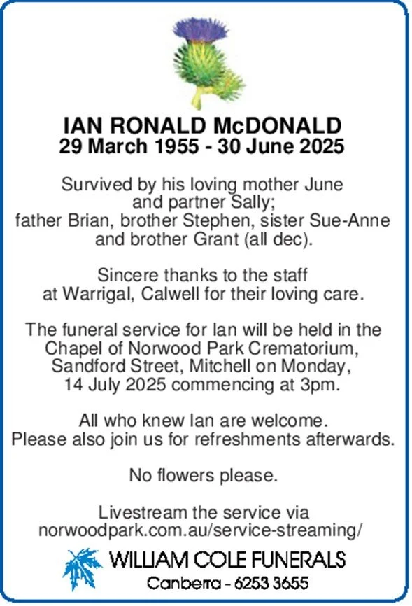 All who knew Ian are welcome. Please also join us for refreshments afterwards.