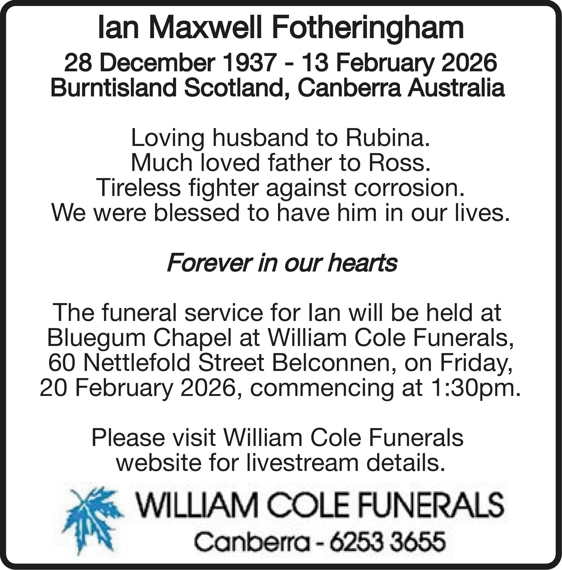 • Bluegum Chapel of William Cole Funerals 60 Nettlefold Street Belconnen, ACT, 2617 Australia (map)
