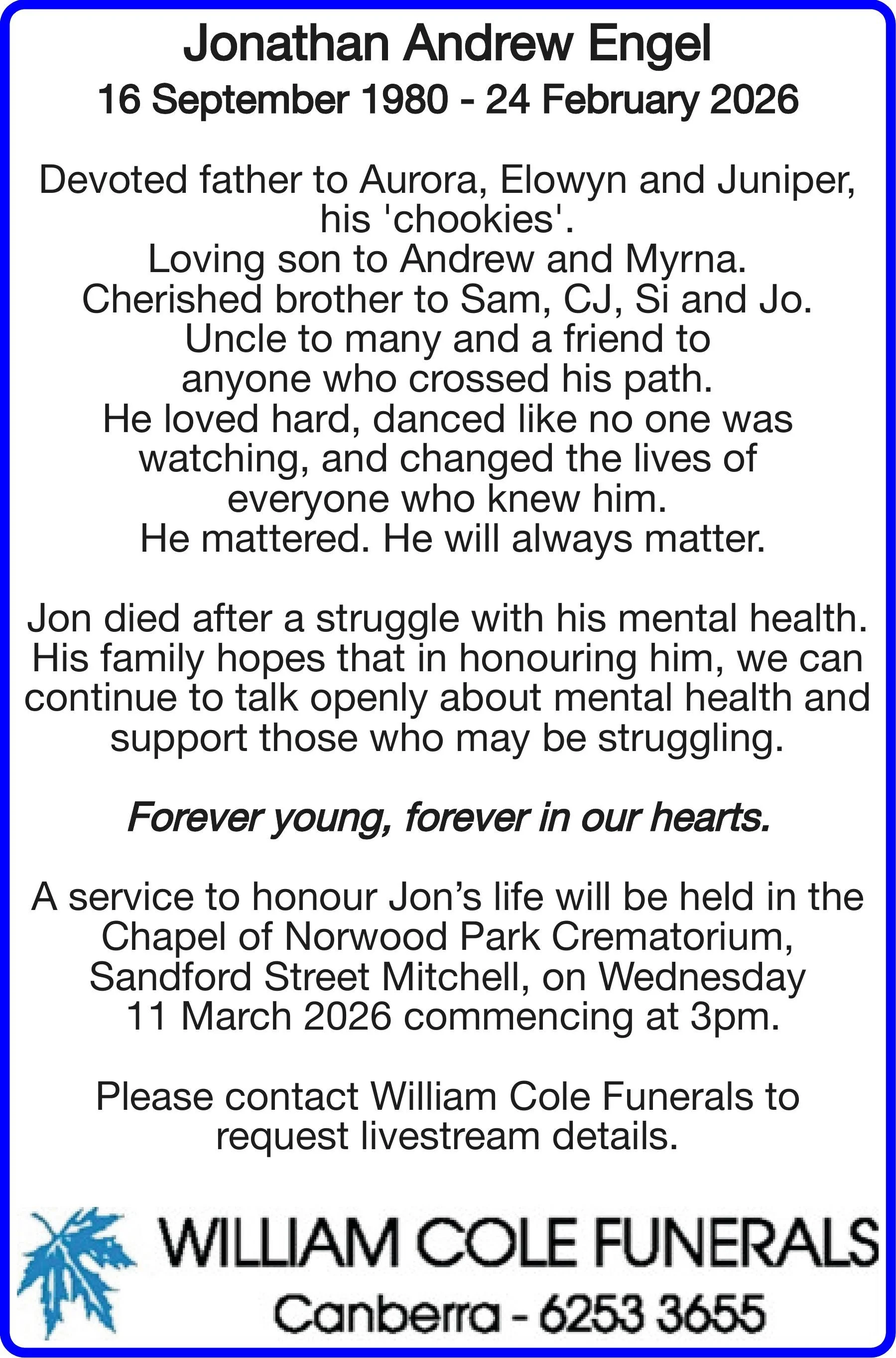 Write your message here and it will be compiled and forwarded on to the family