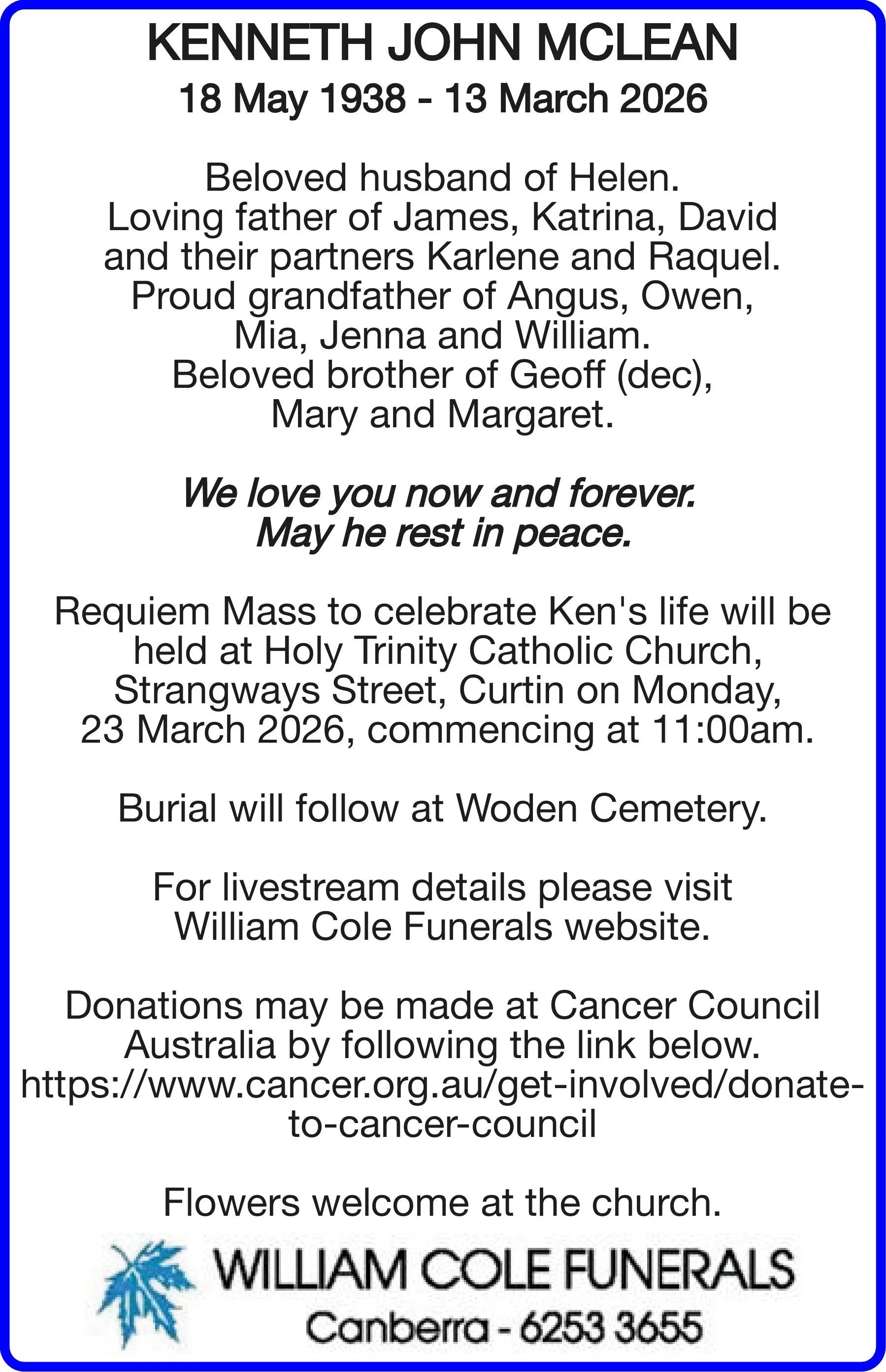 Please consider a donation the the Cancer Council Australia in memory of Ken