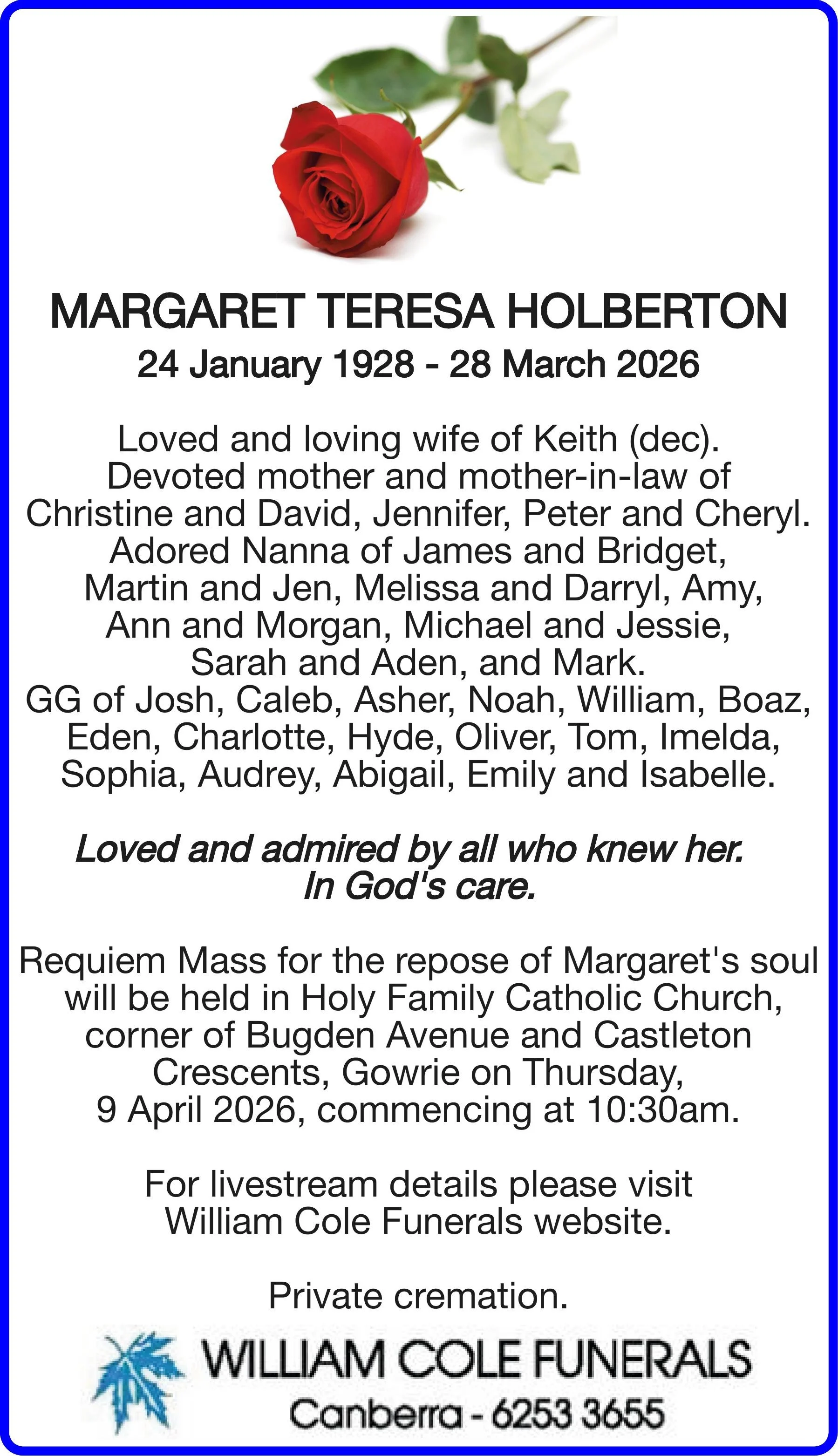 Write your message here and it will be compiled and forwarded on to the family
