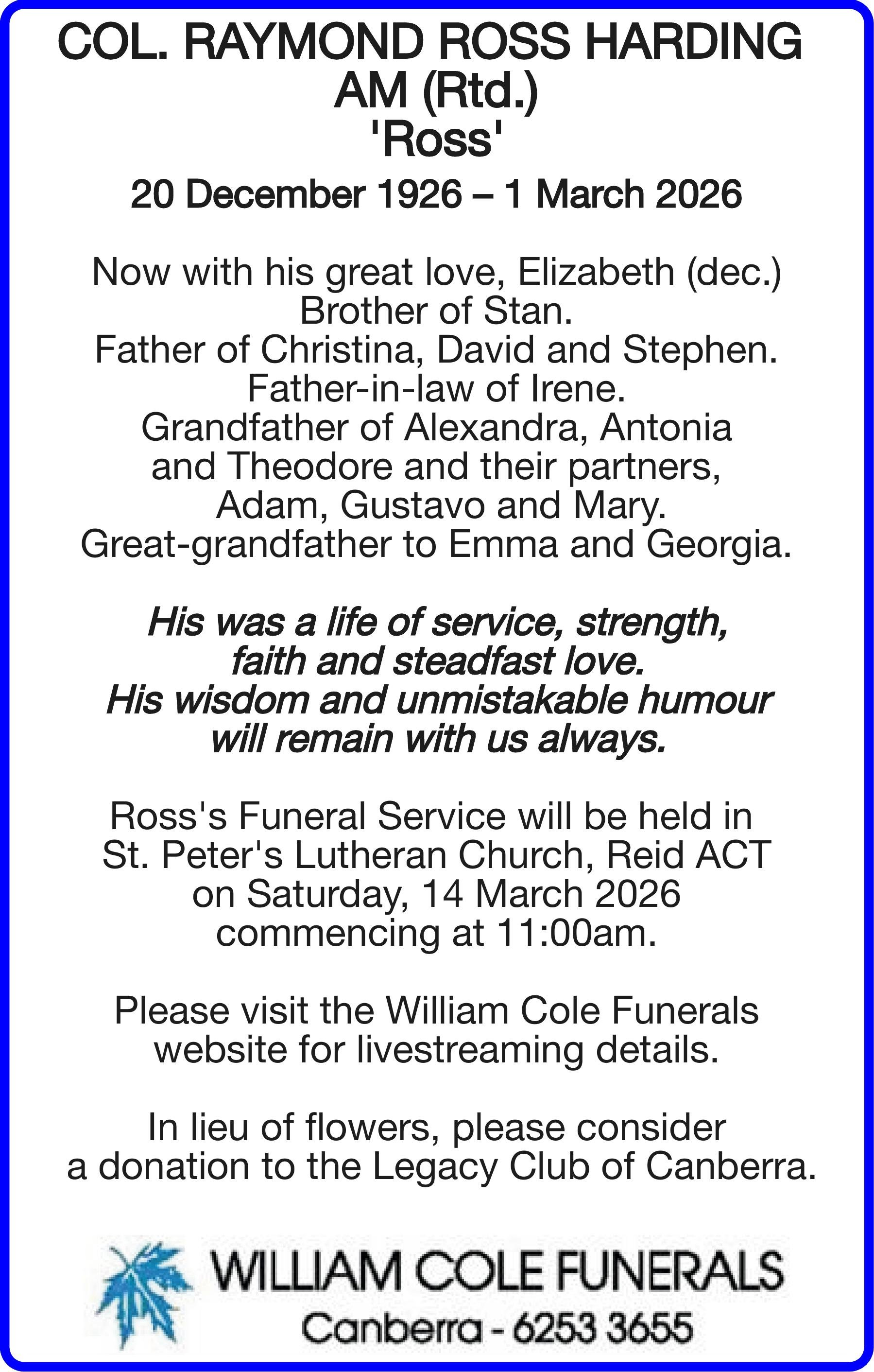 Please consider a donation to the Legacy Club of Canberra in Ross’s memory