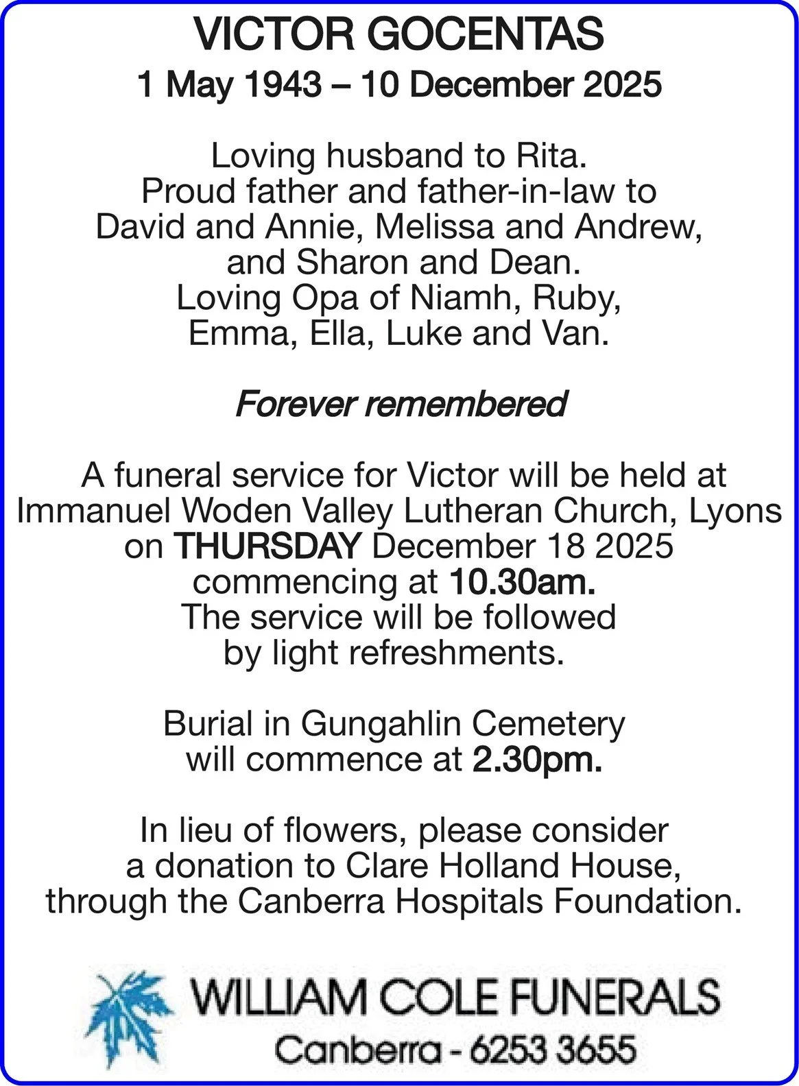 Write your message here and it will be compiled and forwarded on to the family